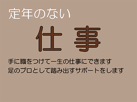年齢・環境により異なる個人個人の足の悩み・トラブルを改善しうる正しいケアは、しっかりとした基本技術と応用技術によりはじめて対処できることです。日本でのフットケアは、これからますます正しいフットケアの知識および技術の浸透の必要に迫られています。一人でも多くの方の足の悩みを正しい技術でケアできるプロを育成してまいります。