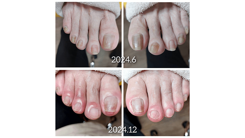 あしゆびが硬直したように動きにくくMTP関節(あしゆび付け根)もほぼ曲がらないお客様です。 定期的にケアを続け夏よりも爪の色(爪床の色)は良くなったものの 寒... -