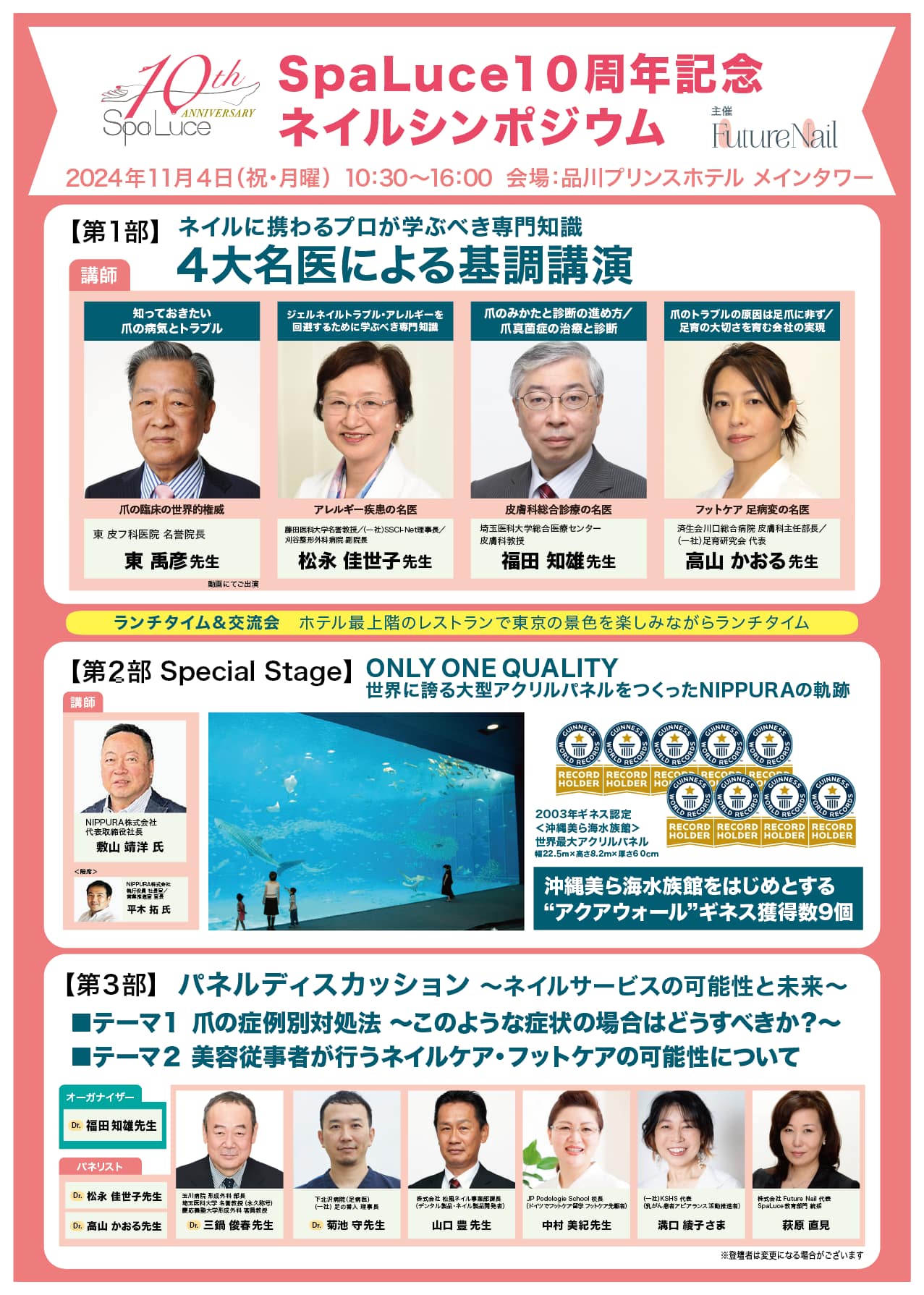 来る2024年11月4日(月祝)に、FutureNail主催 SpaLuce10周年記念ネイルシンポジウム「4大名医によるNailメディカル特別講演/ネイルサービスの可能性」が品川プリンスホテル メインタワー宴会場にて開催されます。第3部のパネルディスカッション「ネイルサービスの可能性と未来」のパネリストとして学院長の中村美紀が登壇いたします。