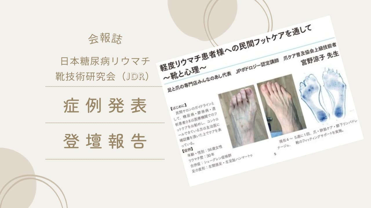 去る2024年9月8日(日)に日本糖尿病リウマチ靴技術研究会(JDR)の第18回研修会・および症例報告会が開催され、JPポドロジースクール認定講師 宮野 涼子先生がJPポドロジストとして、医療機関・技師装具・シューフィッターの皆様に症例報告されました。