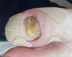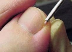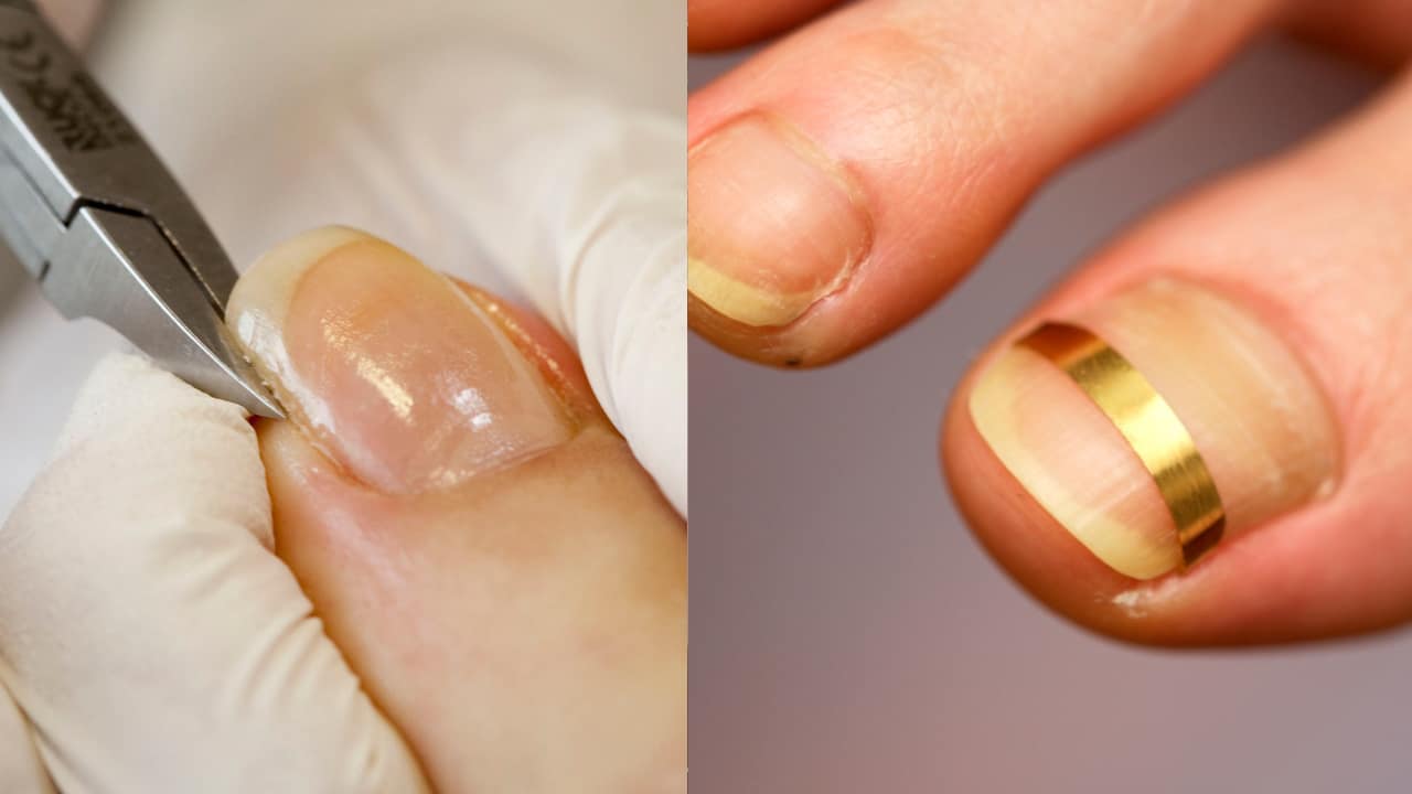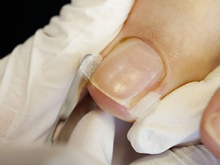 基本の巻き爪ケア。ステンレスプレートで、巻いた爪が食い込まないようにリフトアップ。